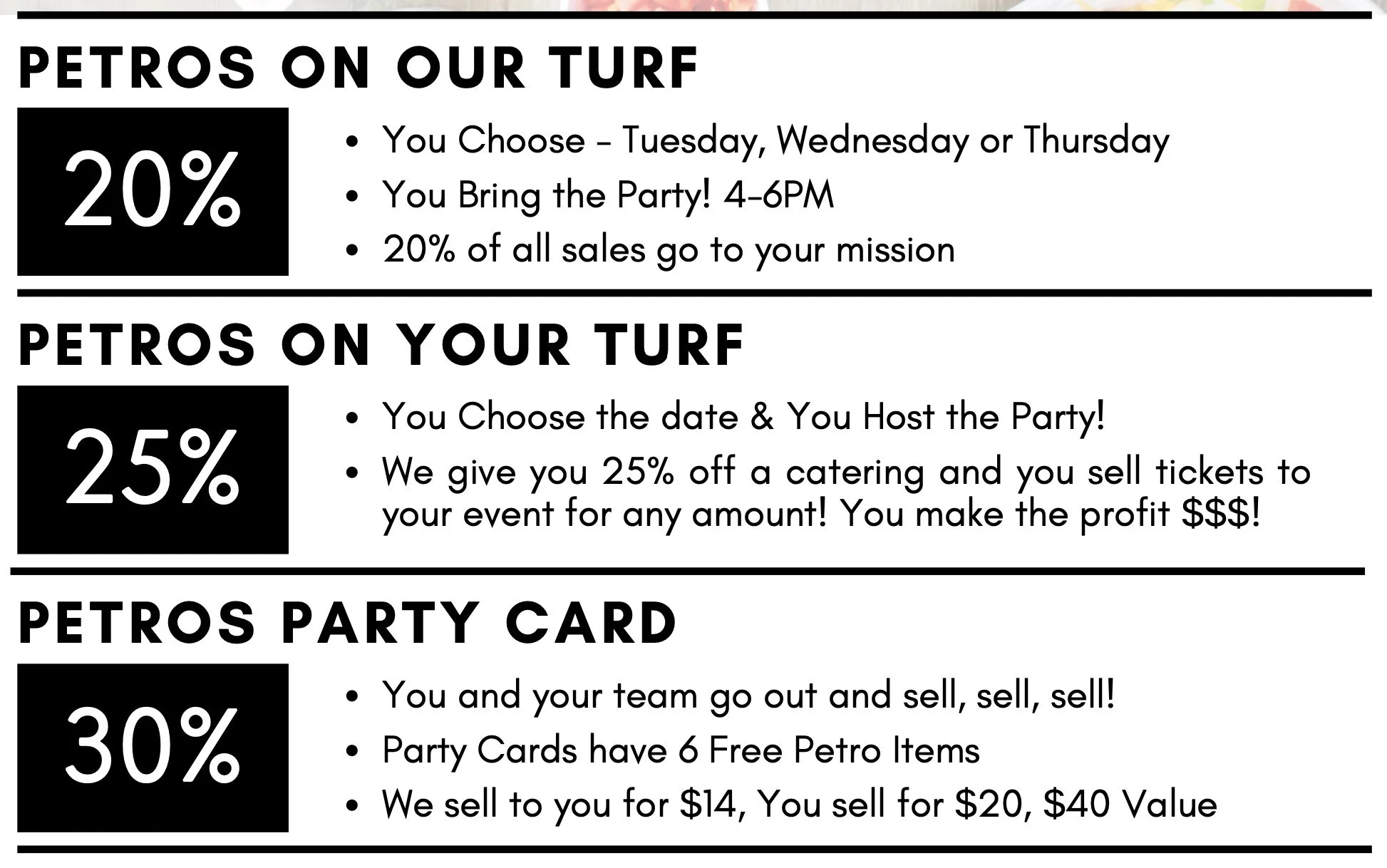 Fundraise with Petro’s and earn up to 30% of your event-day SALES for your nonprofit, church, or other fundraising cause! PLEASE NOTE:ALL requests must be made three weeks in advance of requested date of event. Additional SupportFundraisingfundraising@petros.com